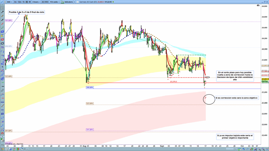 Análisis diario Dax, tipo flash corto, lectura de 2 a 4 minutos, con las claves del día. Ondas de Elliot, estructuras de precio, zonas clave y objetivos.