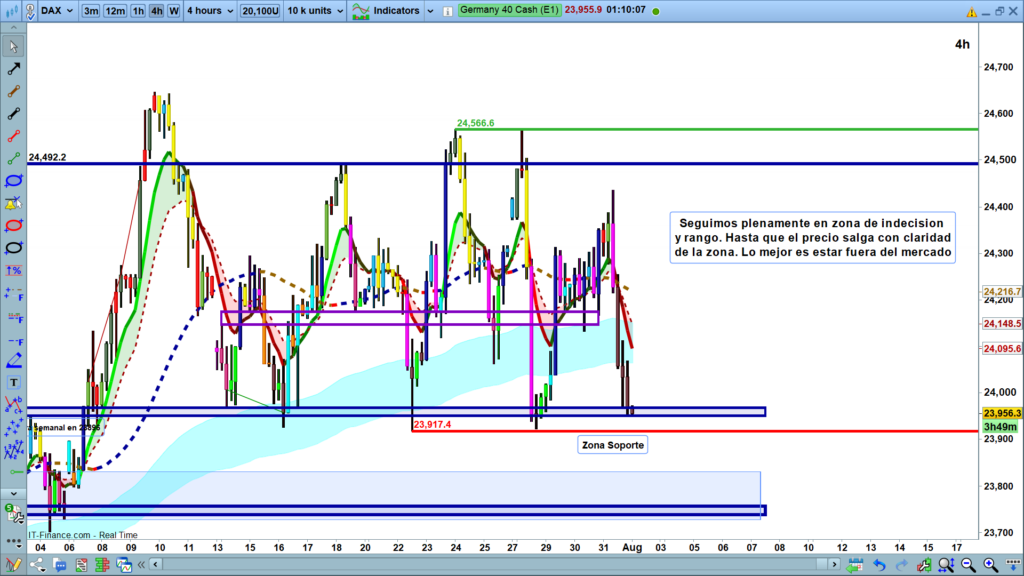 Análisis diario Dax, tipo flash corto, lectura de 2 a 4 minutos, con las claves del día. Ondas de Elliot, estructuras de precio, zonas clave y objetivos.
