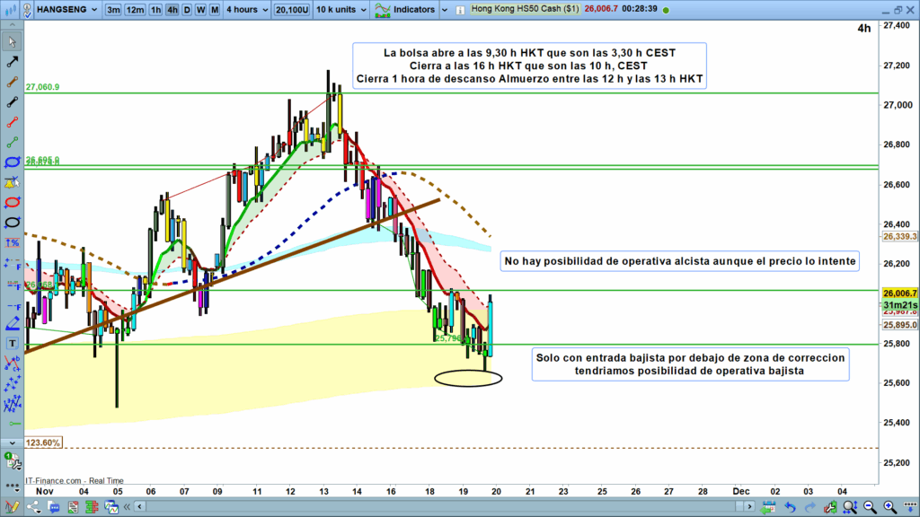 La tendencia dominante es indiscutiblemente bajista. Como indico claramente en el gráfico, en la situación actual considero que «alcista no es posible la operativa». Ir en contra de esta fuerza sería un error estratégico.