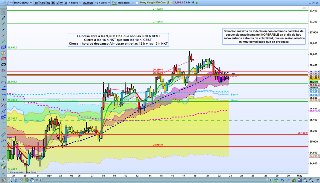 • El Veredicto (Prohibido Operar): Al igual que vimos en el DAX con su «rectángulo inoperable», el Hang Seng recibe exactamente la misma sentencia. La directriz operativa principal para esta sesión es tajante y preventiva: el mercado está «practicamente INOPERABLE en el dia de hoy». Intentar adivinar la dirección en este entorno de ruido es exponer el capital innecesariamente.