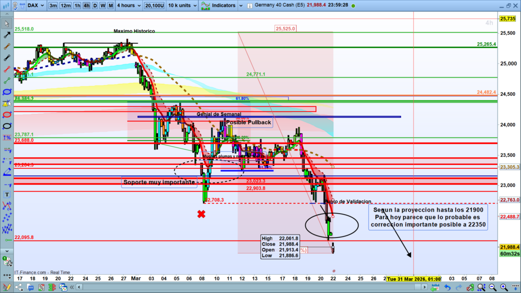 • Escenario Operativo para Hoy (Rebote): A pesar de la inercia bajista, la caída ha sido tan vertical que el mercado necesita un respiro. La estrategia para la sesión de hoy cambia el sesgo temporalmente: «Para hoy parece que lo probable es correccion importante posible a 22350». Se espera, por tanto, un impulso alcista para aliviar la sobreventa.