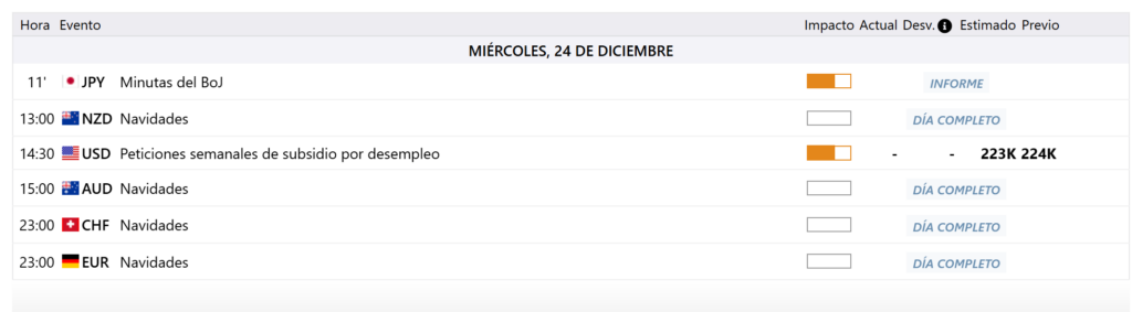 Publicado miércoles, 24 de diciembre de 2025, a las 00 h UTC. Las horas del Calendario Económico, son UTC+2.