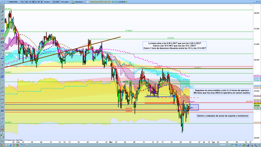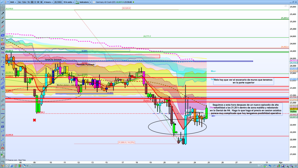 Veredicto Operativo (Inoperabilidad Técnica): Con el precio encerrado en una zona errática y bloqueado por un techo de «muros», la conclusión es tajante se invita a quedarse fuera del mercado. Se advierte que, «Haga lo que haga el precio en sesion asiatica parece muy complicado que hoy tengamos posibilidad operativa». Parece que el DAX está completamente encajonado, asfixiado por esa «zona maldita» y las pesadas resistencias que tiene encima, obligándonos a mantener la prudencia y proteger el capital una vez más.