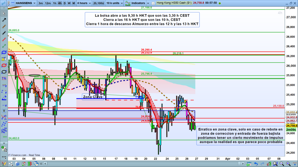 Atrapados en la Incertidumbre: Al igual que el DAX, el mercado asiático no logra sacudirse la indecisión con la que ha convivido gran parte de la semana. Se define el comportamiento actual del precio de forma directa: está «Erratico en zona clave». Visualmente, vemos las últimas velas atrapadas en un rango muy estrecho en la parte inferior del gráfico, sin dirección clara.