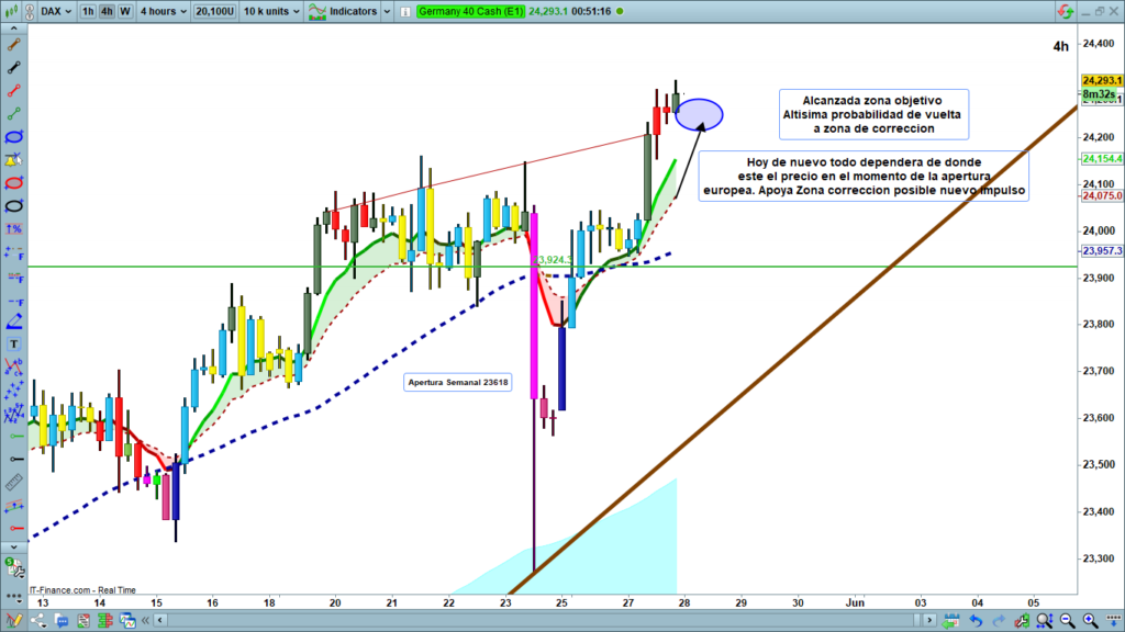 Análisis diario Dax, tipo flash corto, lectura de 2 a 4 minutos, con las claves del día. Ondas de Elliot, estructuras de precio, zonas clave y objetivos.