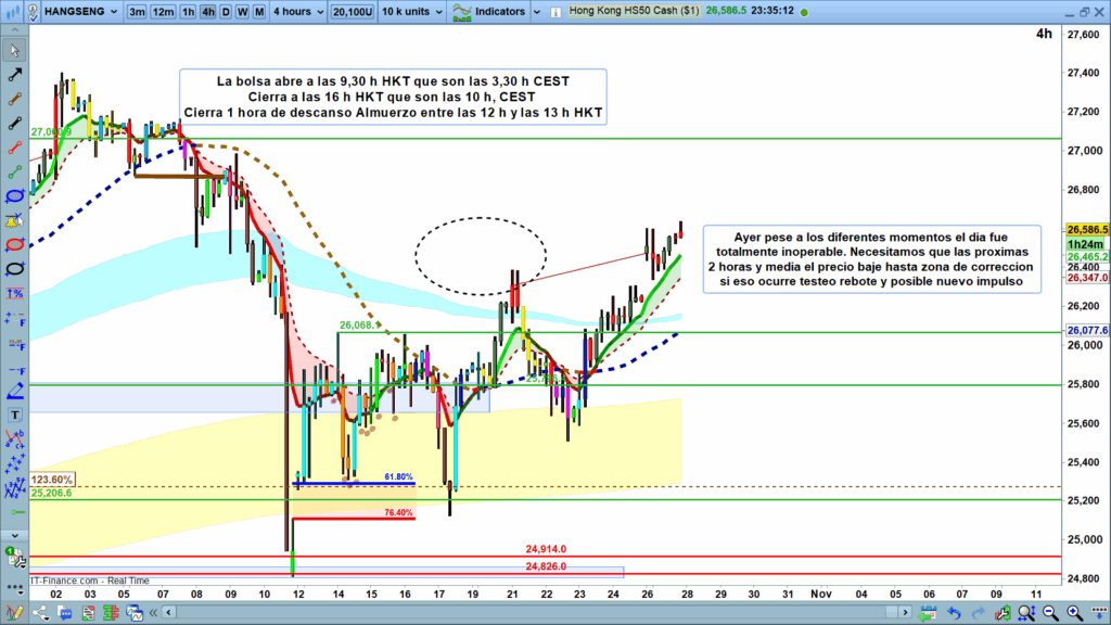 Mi estrategia para hoy no es perseguir el precio en estos niveles actuales. A mi entender, necesitamos paciencia. Como indico en el gráfico, necesitamos que el precio baje y realice un retroceso hasta la «zona de corrección» (cerca del nivel 26,347).