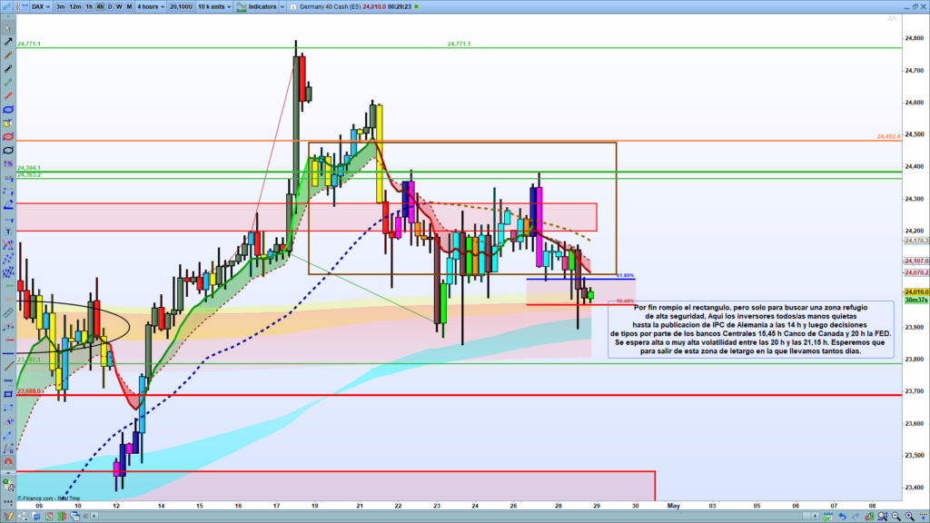 Veredicto Operativo: El DAX ha salido de su jaula técnica, pero no para iniciar una tendencia, sino para buscar refugio. El mercado se ha atrincherado a la espera de la FED y la inflación alemana. El análisis gráfico se rinde hoy ante el calendario económico: la orden es mantener la plataforma de trading cerrada y las «manos quietas» hasta que pase el tsunami de las 20:00 h. Europa ha decidido atrincherarse y buscar una «zona refugio» antes del dato de inflación alemán y la FED