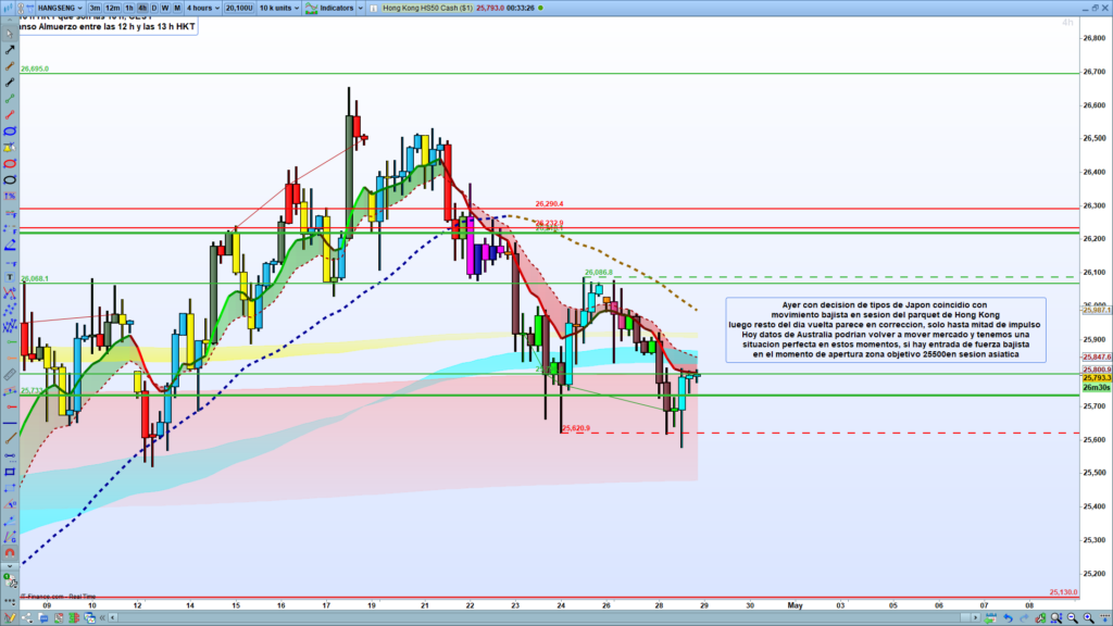 El Plan de Vuelo (Oportunidad Bajista Clara): A diferencia de la parálisis total y el «refugio» que acabamos de ver en el DAX, el Hang Seng sí nos plantea una ventana de acción directa. Se afirma que «tenemos una situacion perfecta en estos momentos». La directriz operativa es milimétrica: si en la apertura se confirma una «entrada de fuerza bajista», el plan exige buscar posiciones cortas con una «zona objetivo 25500 en sesion asiatica».