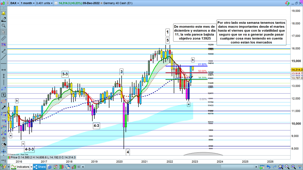 En gráfico mensual del dax40, de momento sin cierre de la vela del mes en curso, no hay nada definitivo ni estudiable. Pero es importante el detalle, de que la vela mensual actual, no ha realizado de momento nuevo máximo, y que está dibujando una vela bajista sin fuerza. A realzar que este movimiento, lo está haciendo precisamente en la zona del 61,8%, de retroceso o corrección del impulso, desde máximos históricos, hasta los, 11809.