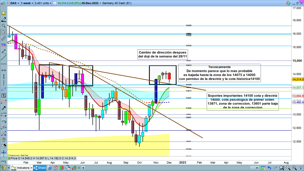 En gráfico semanal del dax40, vemos como después del doji de la semana anterior, la semana pasada tuvimos una vela de cambio de dirección de momento correctiva. La zona objetivo, subirá sustancialmente con el inicio de esta semana, con lo que el objetivo será la zona comprendida entre los 14075 y los 14000.