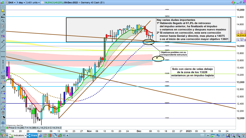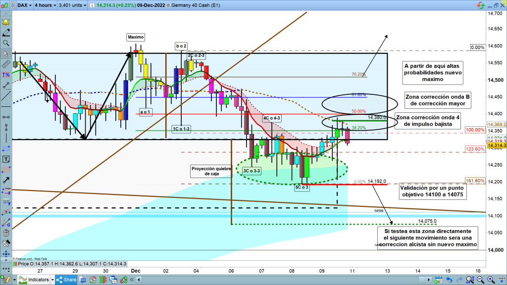 Sí, en cambio, superamos con cierre de velas, por encima de los 14380, varios posibles objetivos. o el movimiento anterior que bajo hasta los 14192, fue una onda A, de 3 movimientos abc, y ahora estamos en onda b, zona a alcanzar los 14400 hasta 14450, y después de este movimiento, tendríamos una onda C hasta la zona de los 13900 a 13800, con el eje en los 13871, cota histórica importante. Ahí finalizaría la corrección y volveríamos a nuevos máximos.