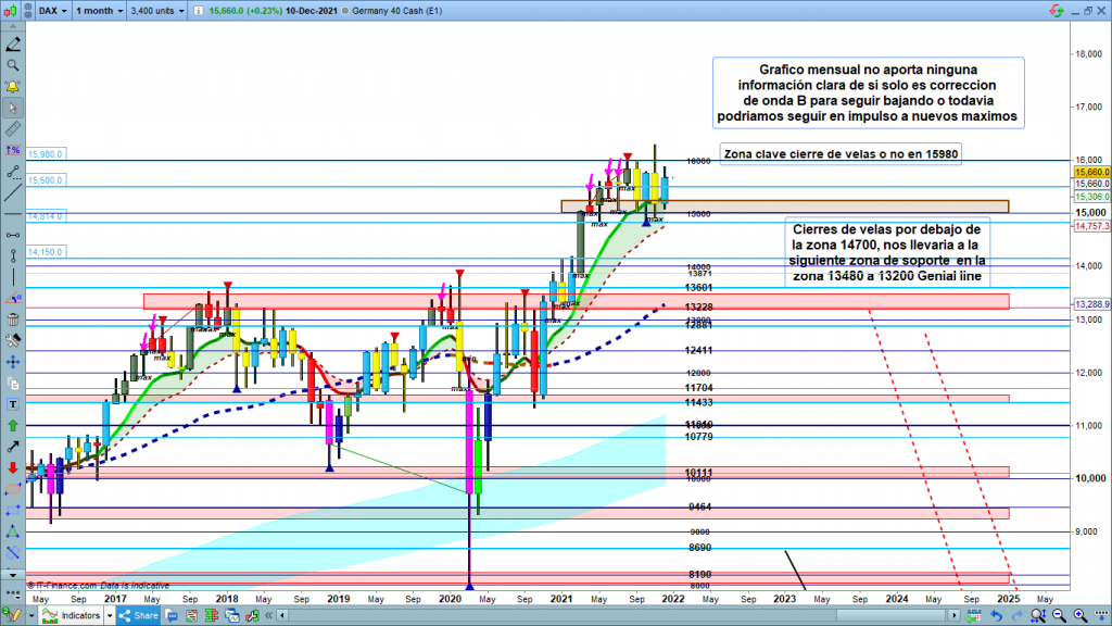 En gráfico mensual del dax 40, poca información importante de los movimientos futuros que nos esperan, podemos estar en corrección u onda B o 2, para seguir bajando y mucho. O, por el contrario, después de haber realizado la corrección sobre zona corrección de gráfico mensual, que es importante, seguir el impulso alcista en búsqueda de nuevos máximos importantes. Sigo pensando por el conteo de gráficos trimestrales y superiores que lo más probable es corrección bajista importante. Mínimo hasta zona de apertura anual 2021, en 13871 y hasta zonas 13601 y zona soporté grandes gráficos en 13480 a 13200. Con muchas probabilidades de ser una corrección mucho mayor de la gran estructura, a niveles mucho más bajos. Pero…, debemos ir por validaciones y confirmaciones, ya que un nuevo máximo histórico proyectaría el precio muy posiblemente 1000 puntos más arriba después de diversas estructuras.