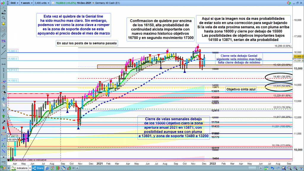 En gráfico semanal del dax40, el escenario parece un poco más claro. Fijaros que los mensajes que dábamos la pasada semana, siguen siendo correctos esta semana. Aquí sí que vemos, de una forma más clara, las dos posibles evoluciones del precio. por un lado, si esta semana tenemos un alto hasta la zona del 15980 a 16000, y el cierre de vela fuera por debajo de los 15500, las posibilidades de la opción bajista importante, mínimo hasta la zona del 13871, apertura anual de este año 2021, serian muy altas. en cambio, si llega hasta zona de los 16000, y la sobrepasa de forma clara, sobre todo con una confirmación de quiebre de la zona SoR, 16110 a 16150, las posibilidades de un nuevo máximo histórico y continuidad en principio hasta 16750, y posiblemente en un segundo recorrido hasta 17300, sería la opción más clara y de más probabilidad, obviamente esto después de diversas estructuras de impulsos y correcciones.