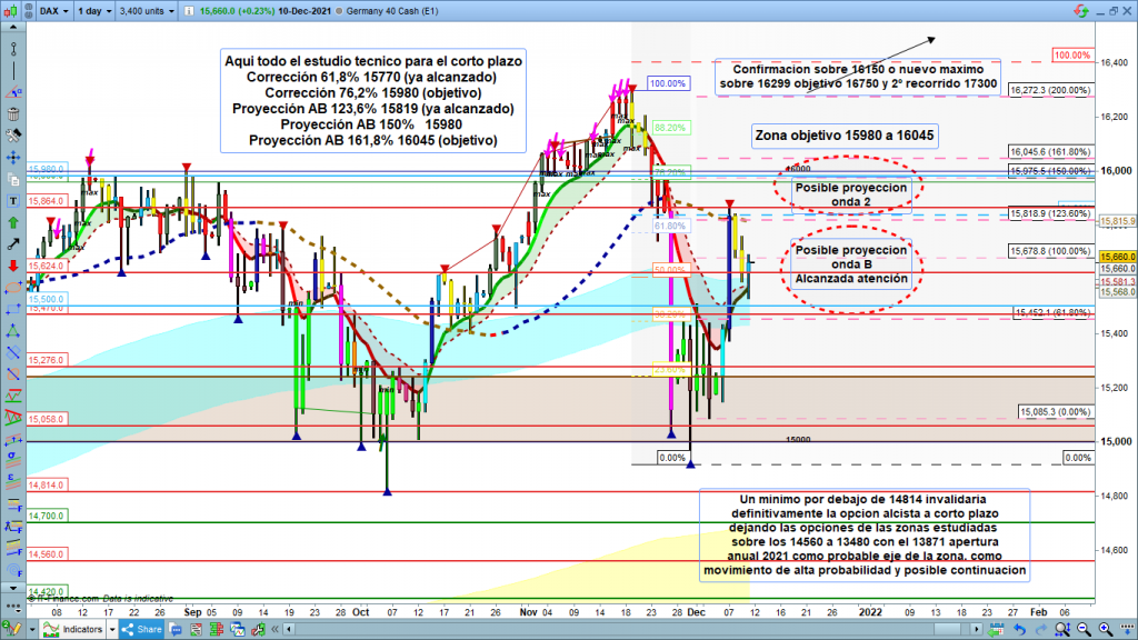 En gráfico diario del dax40, todo el escenario y todas las posibilidades en el corto plazo. De entrada vemos como la zona de proyección para una teórica onda B, ya ha sido alcanzada, y testeo en la zona superior de esta proyección. La zona de proyección de una posible onda 2, ha sido alcanzada en su parte inferior, sin embargo, el estudio de la estructura no parece haber finalizado todavía. Por proyección de la teórica zona AB, la zona más probable a alcanzar es la zona entre los 15980 y los 16045, que además se corresponde con el 76,2% de la zona de corrección. El 88,2% de la zona de corrección está en los 16135, cualquiera de estas dos opciones o su zona intermedia validaría más la opción de posible onda 2, que posible onda B. Una confirmación de quiebre por encima de 16150, o un nuevo máximo histórico, recordar que cambiaria toda esta estructura, llevándonos en varios movimientos hasta las zonas 16750 y posteriormente en otro recorrido hasta 17300.
