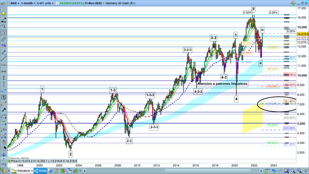 En gráfico mensual del dax40, a nivel estructural sigo pensando que este es el conteo más probable. Aunque la onda A, parece que quedo más corta de la zona por mi esperada, sin embargo, vemos que si ahora cumple las proyecciones, el resultado final es exactamente la zona esperada, mínimo el 61,8% de todo el impulso entre la zona de los 0 o 747, último mínimo después de pasar de Xetra a Dax en el 1987, con base 1000, y los 16298.