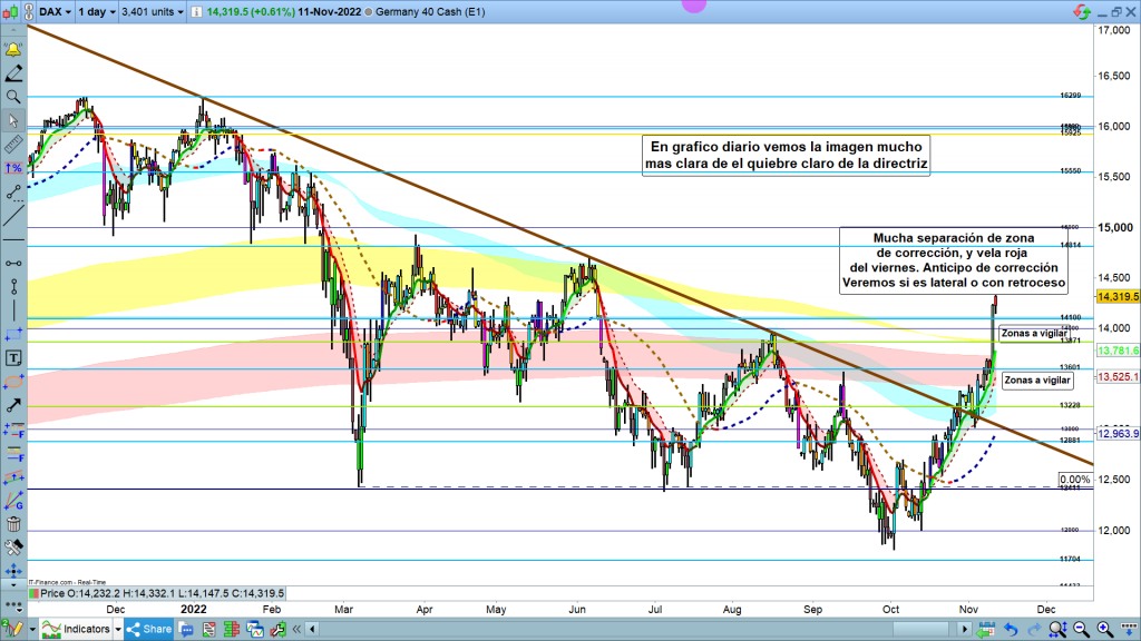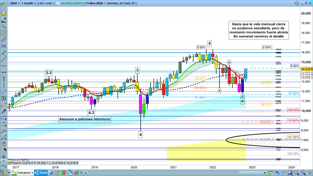 En gráfico mensual del dax40, al detalle de momento, vela en curso, como siempre explico, hasta que la vela está cerrada, no es analizable. En el periodo de una vela, en este caso mensual, pueden pasar y pasan siempre muchas cosas. Sin embargo, de momento, si la vela cerrara así, es una situación técnica de claro quiebre de la zona de corrección y Genial line de mensual. Por tanto, vamos a ver como cierra y sobre todo como evoluciona la vela siguiente, la de diciembre.