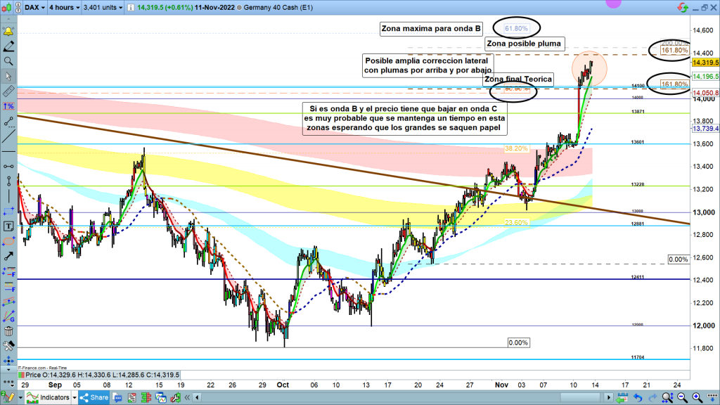En gráfico de 4 horas del dax40, poco a comentar, solo el detalle técnico de la zona en curso. El 50% de toda la corrección, desde máximos 16298, hasta los 11809, está en la cota histórica del 14100. El 61,8%, zona máxima teórica y solo alcanzable con pluma de diario o semanal, está en la zona de los, 14600. Si mi percepción es correcta, el precio estará en esta zona, durante bastantes días en rango lateral, teóricamente los primeros días o primera semana, testeando y marcando la parte superior de la caja de distribución. A partir de aquí en rango con velas erráticas y movimientos de volatilidad alcista al tocar la parte inferior de la caja de distribución intentando mantener el máximo de tiempo posible la sensación de mercado alcista.