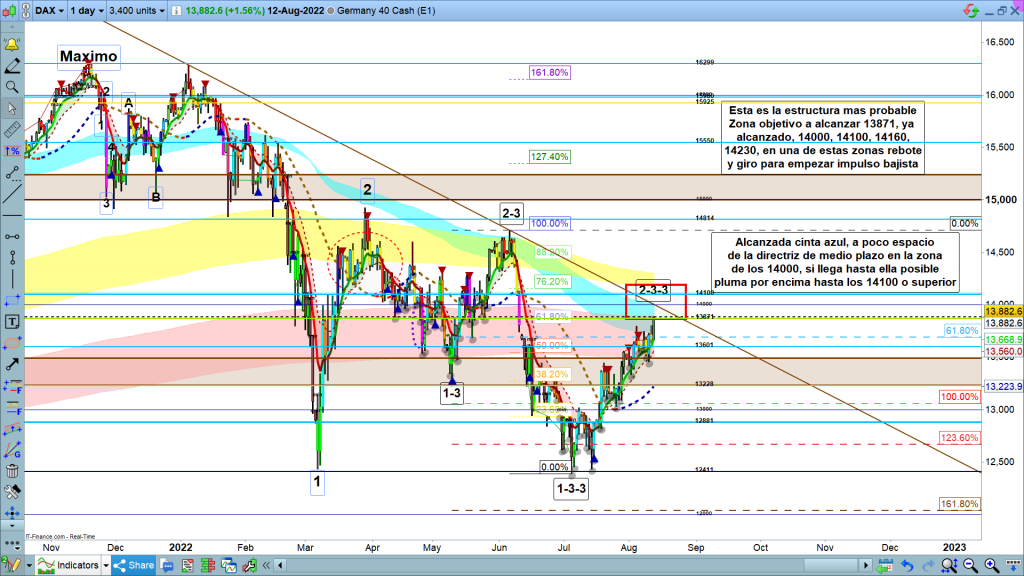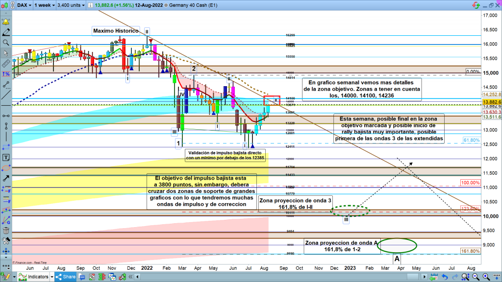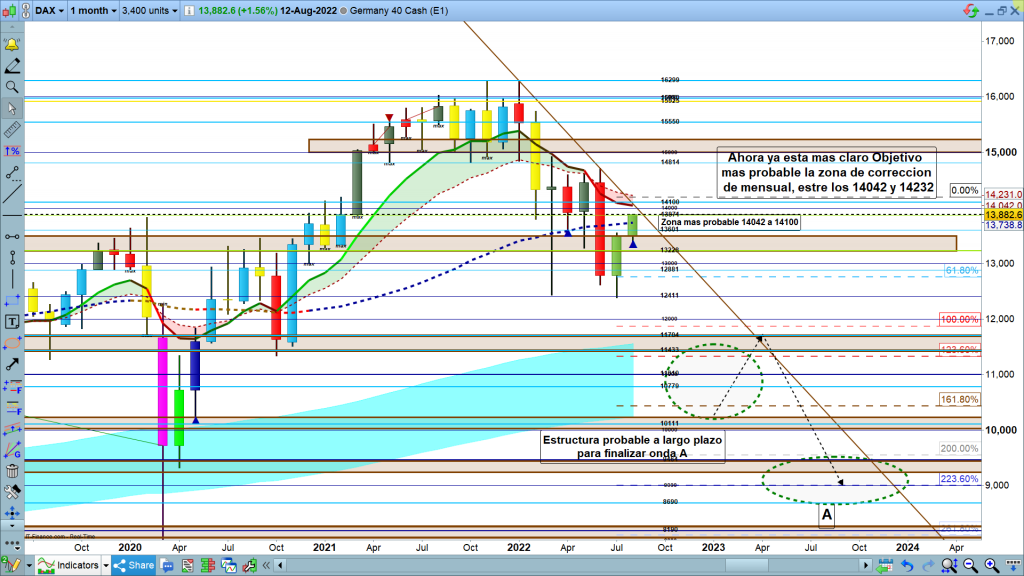 En el gráfico mensual del dax40, lo único significativo, la zona más probable a zona objetivo. Habiendo llegado la vela mensual hasta donde llego la semana pasada, lo más lógico y probable es que acabe en la zona de corrección de gráfico mensual, en la zona 14042. Como veremos en este estudio en los gráficos más pequeños, estamos ya en una zona clave muy importante, la zona más probable de final del gran movimiento correctivo, que he enumerado como 2-3-3, como estructura más probable.