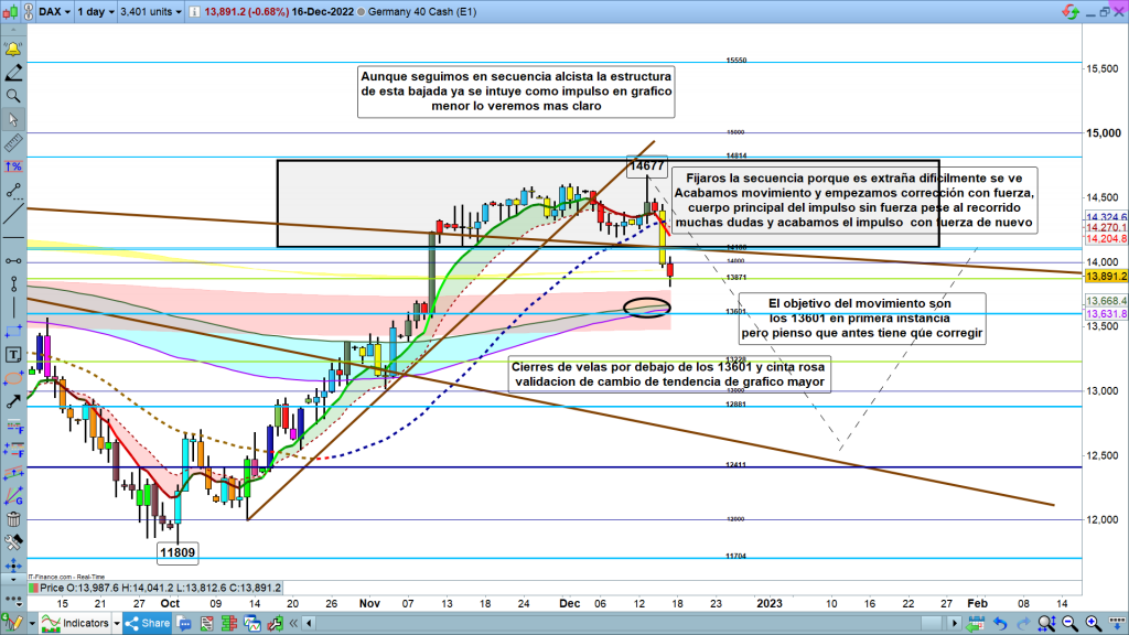 La noticia de la tarde del viernes era que Madame Lagarde, se había cargado el rally de navidad. Esto obviamente es falso. Más decepcionante fue el discurso de Powell, posiblemente el peor de su trayectoria, que además acompañado de los datos del consumo interno, ventas minoristas de Usa, el jueves al mediodía, que desmontaron completamente todos sus argumentos, desencadenaron el rally bajista. Este fue adquiriendo fuerza y que acabo en el caso del Dax, generando una estructura de impulso bajista y validando un cambio claro de tendencia, pendiente técnicamente de confirmar esta semana, con una validación estructural. en la zona de los 13800, aproximadamente si antes tenemos una clara corrección, por lo menos por encima de los 14100.