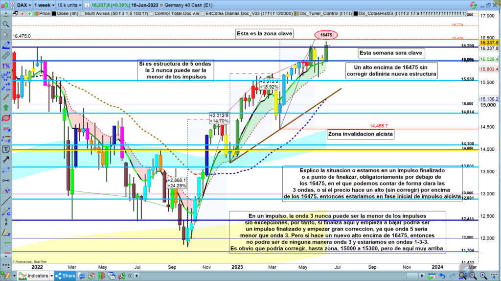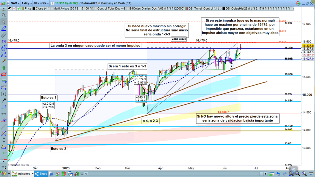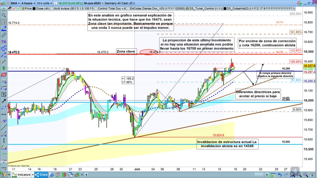 Si cruza la cota de la zona clave, en 16475, la proyección esperada del primer impulso es la zona del 16700, para final de sub onda 3. corrección menor y nuevo impulso cerca ya de los 17000.