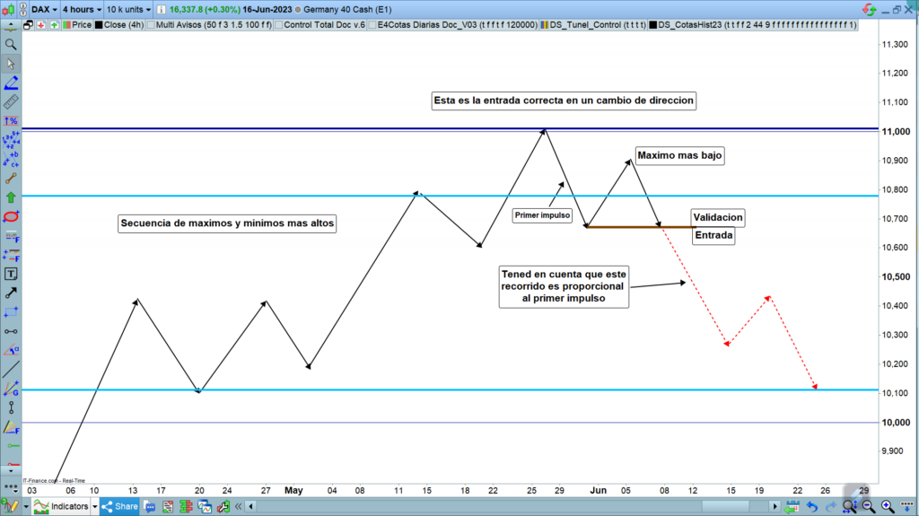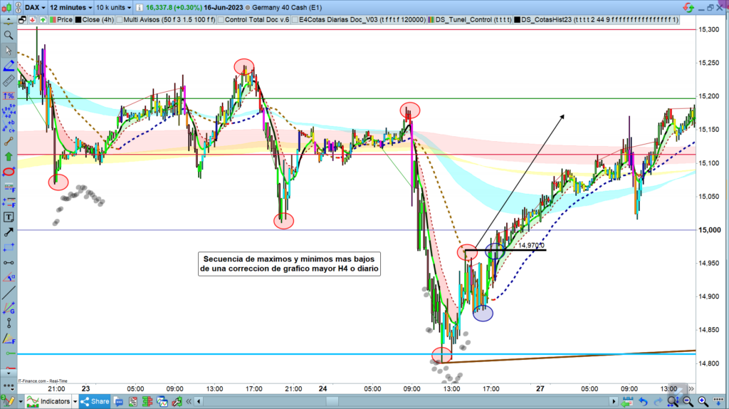 En la situación actual, hay varios activos importantes, que han llegado a zonas cercanas a posibles proyecciones, otros en cambio no, el Dax al contrario precisamente acaba de hacer nuevo máximo histórico, y esto normalmente suele ser motivo de continuación. Sea como sea, el precio puede hacer cualquier movimiento. Lo importante, como siempre explico es saber operar, saber cuando el precio en una temporalidad u otra, marca una nueva estructura, ya sea de continuidad o de cambio de dirección, que esto implica estar horas o días sin poder entrar al mercado en operativa intradía, pues a aprender scalping o dedicar el tiempo a cosas mas provechosas. Pero solo con paciencia, disciplina, conocimientos y experiencia se puede operar de una forma rentable y solida en el mercado.