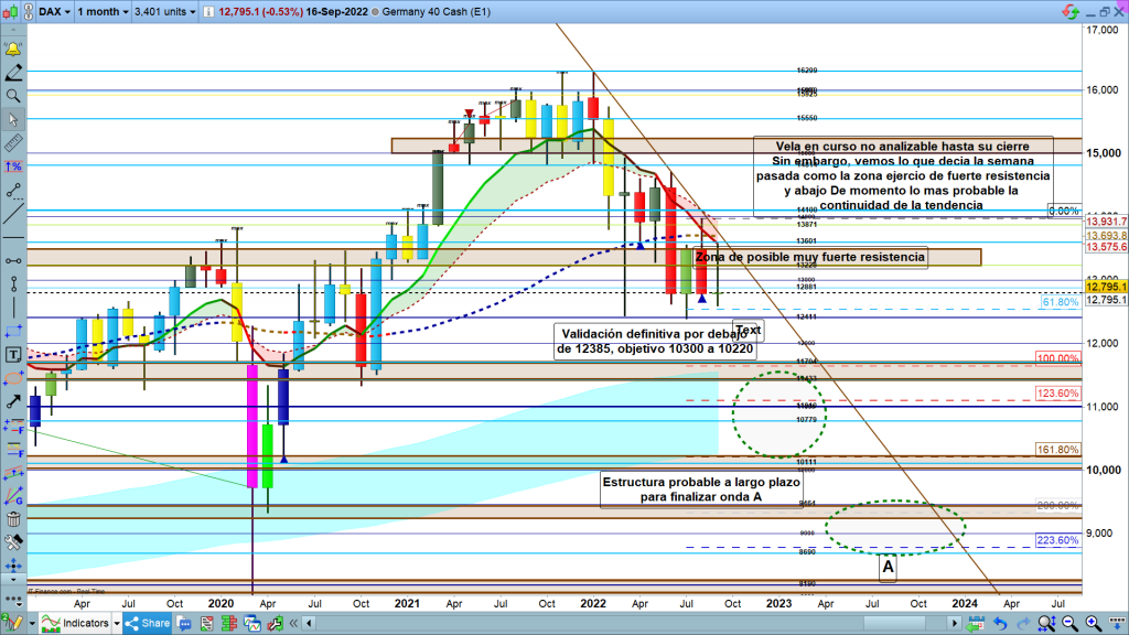 En gráfico mensual del dax40, vela en curso y poca información técnica, la diferencia entre la semana pasada y esta, es que de nuevo testeo a la zona de corrección de mensual, y rebote con fuerza, atención a las semanas venideras, los rebotes en zona contraria a zona de tendencia, suelen ser importantes. De nuevo en mensual, ya tenemos el movimiento técnico que avalaría lo que hace días planteo, mínimo por debajo de 12385, debería llevarnos en pocos días a zona 11704, como primer movimiento importante, si lo realiza este mismo mes, ver la proyección que esto nos daría, con una importante vela con proyección bajista mucho mas importante. El objetivo de la extendida onda 3-3-3, está en la zona de los 10300 a 10220.