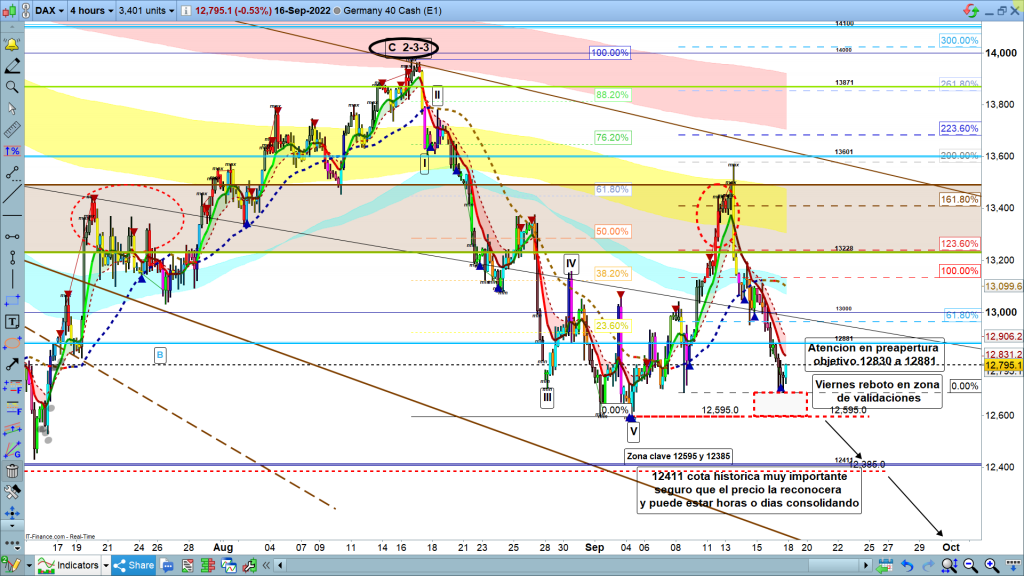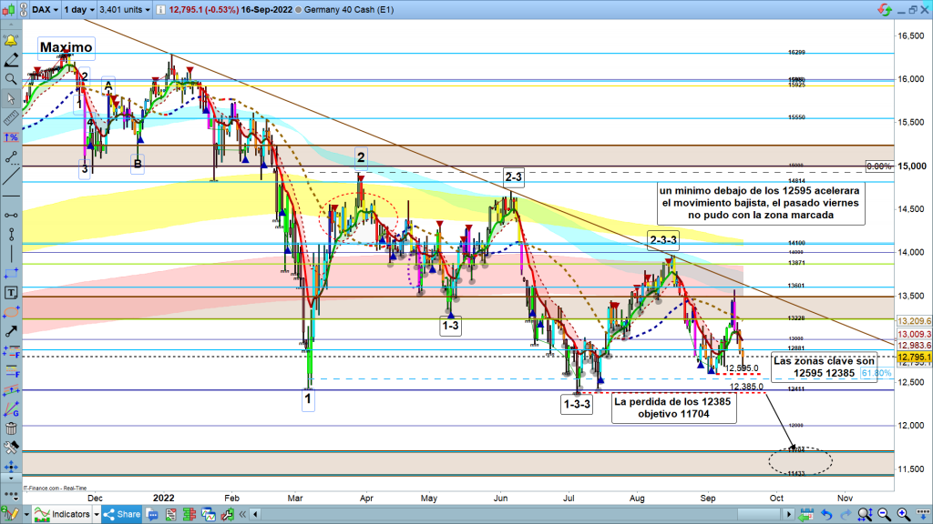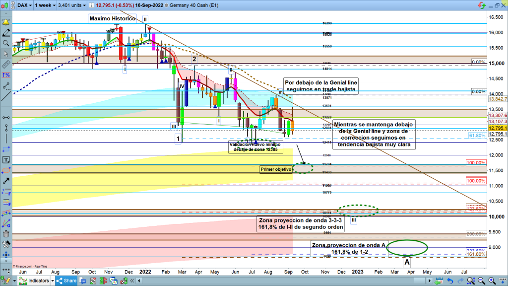 En gráfico semanal del dax40, sencillamente la evolución de la tendencia, mientras estemos por debajo de la directriz y la Genial line y de la zona de corrección de semanal, estamos y continuamos en tendencia bajista importante. Aquí se ve muy clara la operativa, a medida que vayamos teniendo validaciones bajistas, nuevos tramos en dirección de tendencia hasta nuevos soportes importantes. Nuevo mínimo debajo de los 12385, próximo objetivo, la zona de soporte/resistencias de los 11704 a 11433.
