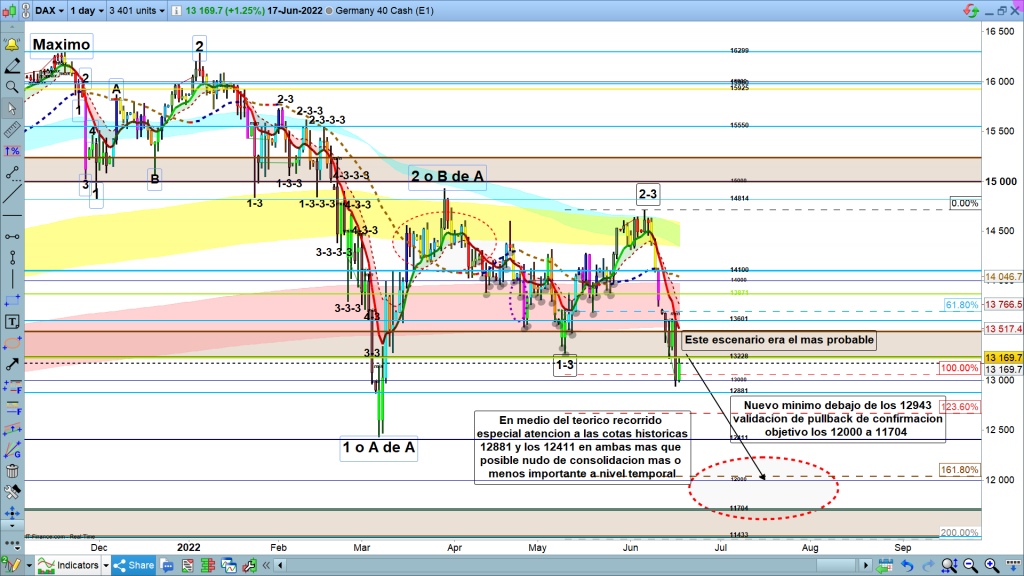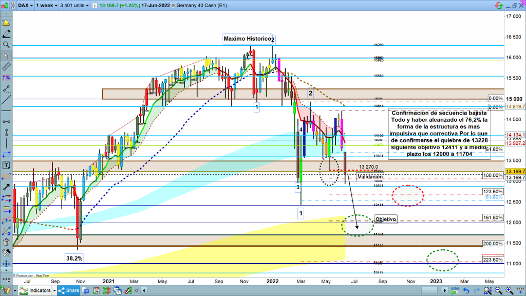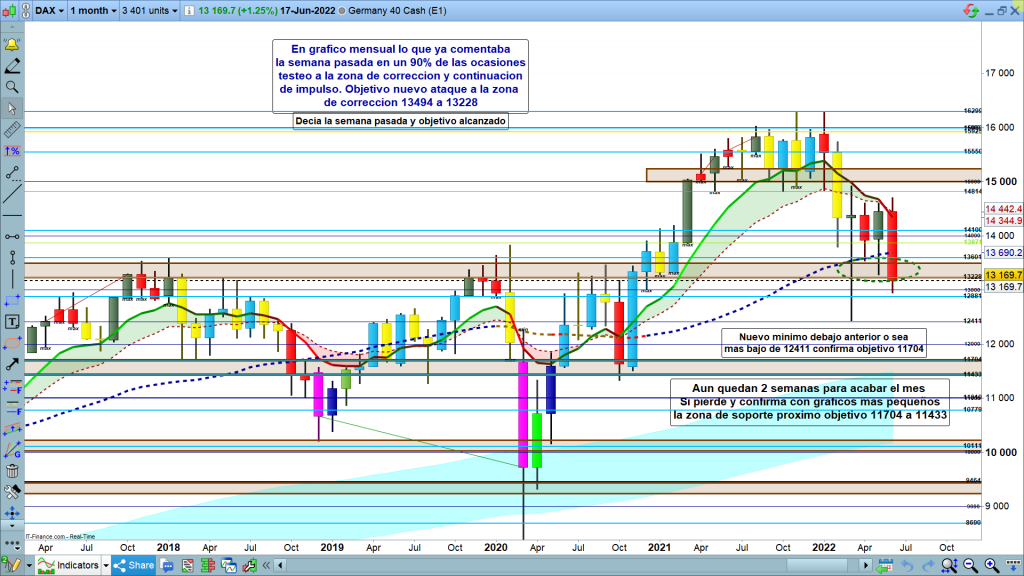 En gráfico mensual del dax40, a falta de 2 semanas aun para el cierre mensual, parece que confirma, al menos de momento, la estructura bajista después del testeo en la zona de corrección. Como siempre las velas no son analizables hasta que están cerradas, pero de momento el actual impulso, vemos como ha llevado el precio hasta la parte inferior de la zona de corrección de grandes gráficos por debajo de los, 13228, como veremos en gráficos de temporalidades menores este detalle puede ser importante. La imagen en este gráfico es muy clara para el medio plazo, un nuevo mínimo testeando la cota histórica del 12411, validaría una vez quebrada la cota histórica muy importante, recorrido hasta la zona 12000 a 11704, inicio de la siguiente zona de soporte/resistencia de grandes gráficos.