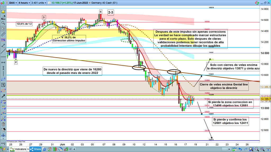 Por arriba, si el precio volviera a situarse con cierre de velas por encima de los, 13228, posible movimiento lateral errático hasta la zona de la Genial line de gráfico de 4 horas, en la zona de los 13350 a 13385, (dependiendo de cuando llegue hasta ella). Cierre de velas por encima de la Genial H4, objetivo la cota de los 13494, parte superior de la zona de grandes gráficos, y si la supera, lo siguiente la zona de la directriz con la cota histórica de los 13601. Solo, después de un improbable quiebre de la directriz, con cierre de velas por encima de ella y de la cota 13601, el siguiente objetivo la zona de los 13871 a 14000. Muchísima suerte y muy buenos trades.