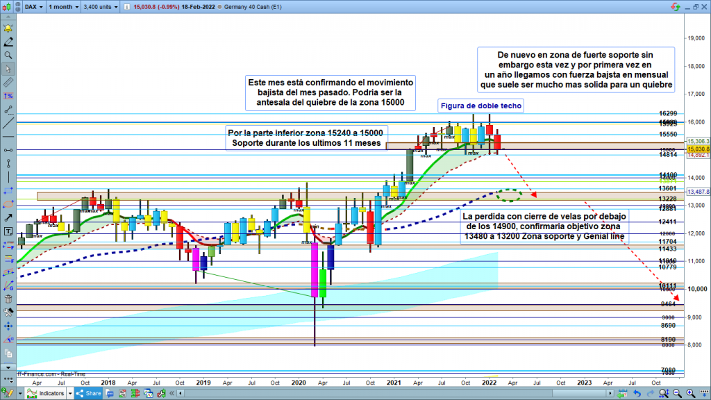 En gráfico mensual del dax40, a falta de 8 días para el cierre de mes de febrero, sigue con fuerza bajista en la zona de fuerte soporte, 15240 a 15000. Cierre mensual por debajo de los 14900, acabaría muy probablemente con este año de indecisión y rango, y el movimiento bajista se aceleraría de forma clara. Primera zona clave pues los 14900, su quiebre con cierre de velas por debajo, objetivo los 13480 a 13200, Genial line de mensual y siguiente zona de soporte de grandes gráficos. Atención al detalle en el gráfico, del inicio de giro de las dos medias de la zona de corrección, un alto porcentaje de veces que se da la situación actual de inicio de giro, normalmente se cumple el recorrido hasta la siguiente zona objetivo esperada.
