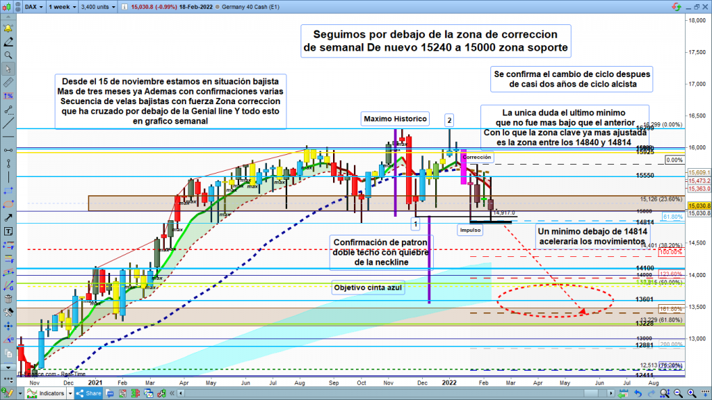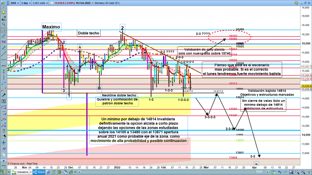 En gráfico diario del dax40, dibujo de la estructura más probable, la ya dibujada, y por consiguiente, proyección de la estructura en el lado derecho del gráfico. La estructura dibujada desde el pasado 24 de enero, técnicamente, aún podría ser alcista, precisamente por el mínimo que no fue más bajo del lunes pasado. Pero esta posibilidad, tal como hemos visto en el estudio de los gráficos mensual y semanal, parece que es muy poco probable. La fuerza bajista, y varios detalles técnicos, indican que la opción más probable es la bajista dibujada. La zona clave, 14814, a menos de 200 puntos del cierre de la semana pasada. Por precaución, sería bueno esperar esta validación, dados los amplios recorridos bajistas, que tendríamos hasta los objetivos marcados.