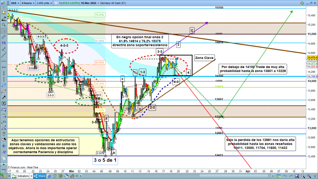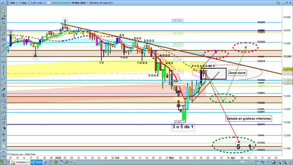 En el gráfico diario de dax40, planteamiento de los escenarios de estructuras posibles planteados, con la caja de la zona clave, que validaría los recorridos, más que significativos, esperados para esta próxima semana.