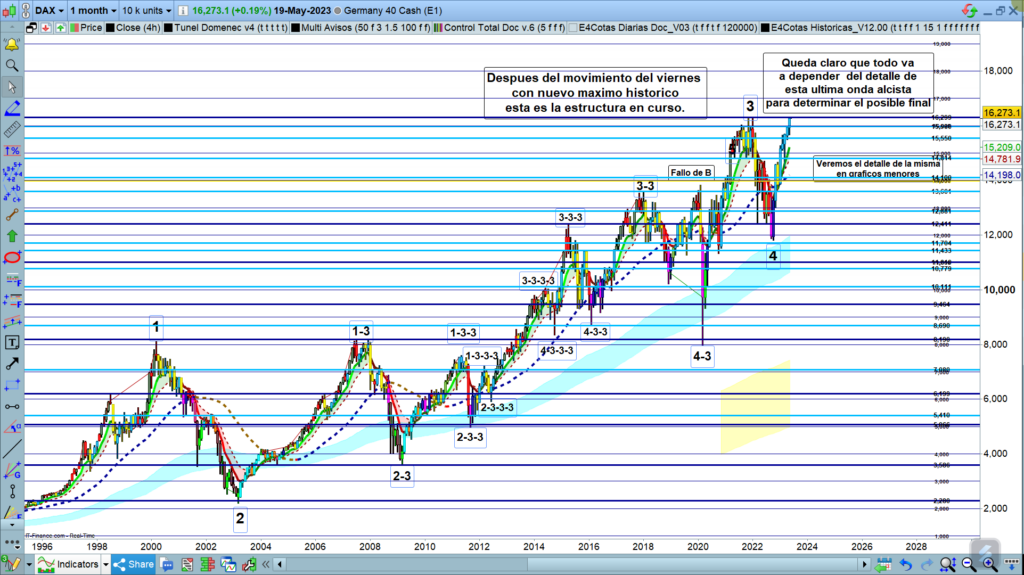 En gráfico mensual del dax40, Después del nuevo máximo histórico del pasado viernes, parece que queda clara la estructura general. Aún sigue habiendo dos posibles estructuras, sin embargo, en ambos casos tenemos recorridos coincidentes, y para la operativa con derivados de alto apalancamiento, lo que son los índices, esto es más que suficiente para seguir siendo ampliamente rentable.