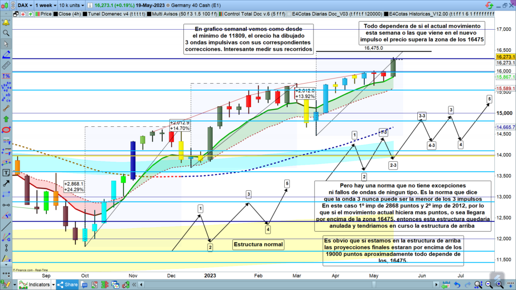Como el primer movimiento impulsivo alcanzó los, 2868, puntos, y el segundo movimiento impulsivo solo alcanzó los,2012 puntos, para qué la actual estructura finalizara prácticamente en la zona alcanzada el pasado viernes, un poco más arriba, el impulso actualmente en curso, no podría superar de ninguna manera los, 2012 puntos del impulso anterior. Esta zona clave tan importante, o sea donde el tercer impulso superaría los, 2012, puntos del impulso anterior, es en la zona de los,16475.
