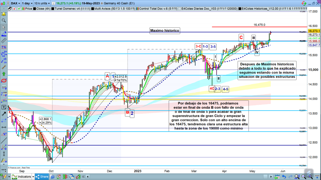 En gráfico diario del dax40, podemos ver la estructura completa y creo que nunca una situación de quiebre de máximo histórico había cambiado tan poco las estructuras posibles en curso. Fijaros como con el detalle de gráfico de diario, siguen exactamente igual de vigentes, las mismas estructuras posibles que ya veníamos arrastrando desde hace un par de semanas.