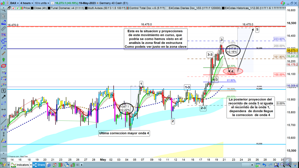 En gráfico de 4 horas del dax40, vemos la estructura en curso al detalle, después de la última corrección mayor, onda 4, tenemos el desarrollo de la estructura ya dibujada, onda 1 y onda 2, onda 1 de 3, y onda 2 de 3, onda 3 de 3, justo en la zona de proyección del 161,8%, onda 4 de 3, y con el máximo histórico, parece que podíamos haber acabado la onda 3.