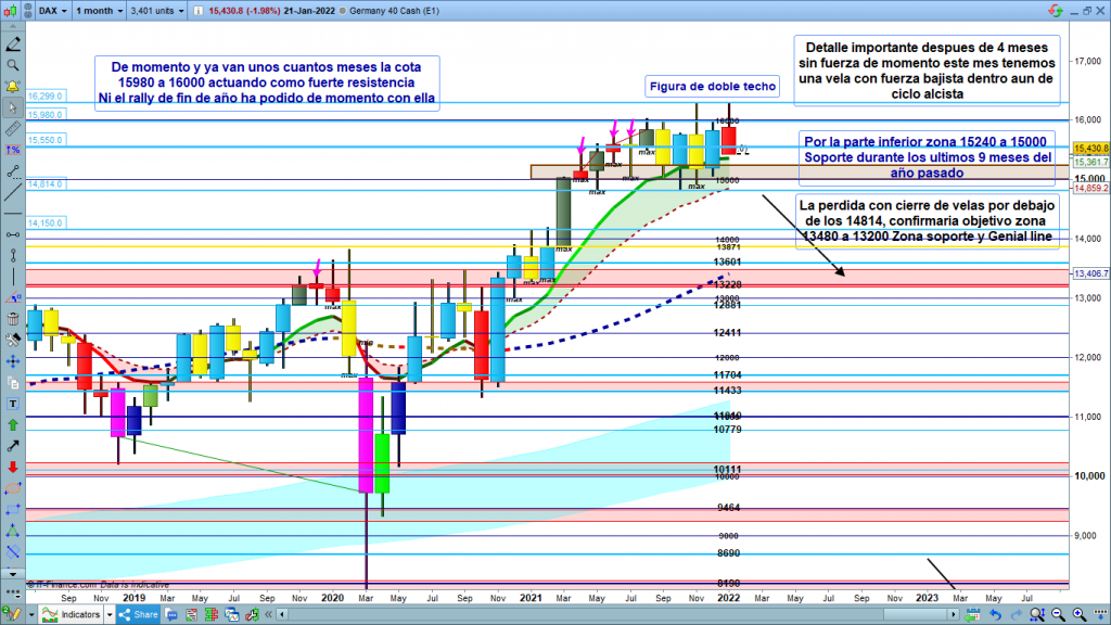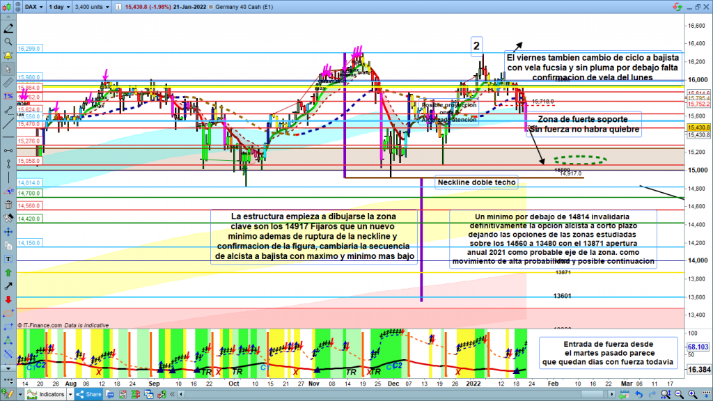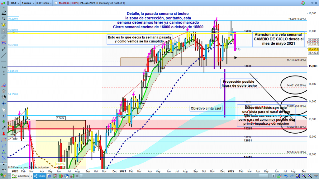 En el gráfico semanal del dax40, varias cosas importantes a tener en cuenta. Estábamos en ciclo alcista desde mayo del 2021. Esta semana vela de cambio de ciclo a bajista. Por otro lado, tal como adelantaba la semana pasada, esta semana teníamos que ver dirección con cierre de vela encima o debajo de las zonas reseñadas. Al final cierre por debajo de 15550, incluso debajo de 15470, detalle muy importante para la apertura semanal de hoy y la sesión asiática. Como siempre especial atención a la pre apertura y apertura del parquet, 8 h y 9 h. En caso de nuevo mínimo, se incrementan las posibilidades de recorrido bajista, hasta la zona 15240 a 15000. En gráfico semanal, vemos que ya estaríamos por debajo de zona corrección y Genial, con lo que con la confirmación del recorrido bajista el objetivo es la cinta azul. El segmento vertical de color violeta es la proyección de la posible figura de doble techo, en caso de ruptura de la neckline en la zona de los 14917.