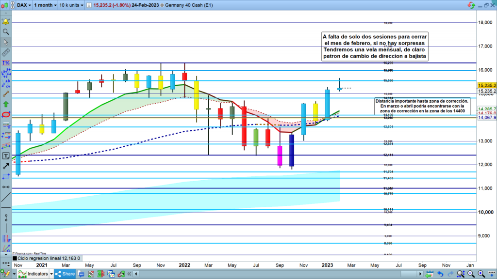 En gráfico mensual del Dax40, dos detalles importantes, a falta solo de dos sesiones para finalizar el mes y, por tanto, la vela mensual, vemos que podría dejar un patrón claramente de final de movimiento, y de continuación bajista. Además, también podemos ver, que la distancia desde la vela hasta la zona de corrección, coincidente en esta zona con la Genial line de gráfico mensual, es importante, con lo que como veremos en gráficos menores, en caso de validar movimiento bajista, tenemos recorridos interesantes en el medio plazo hasta chocar con la zona de corrección.