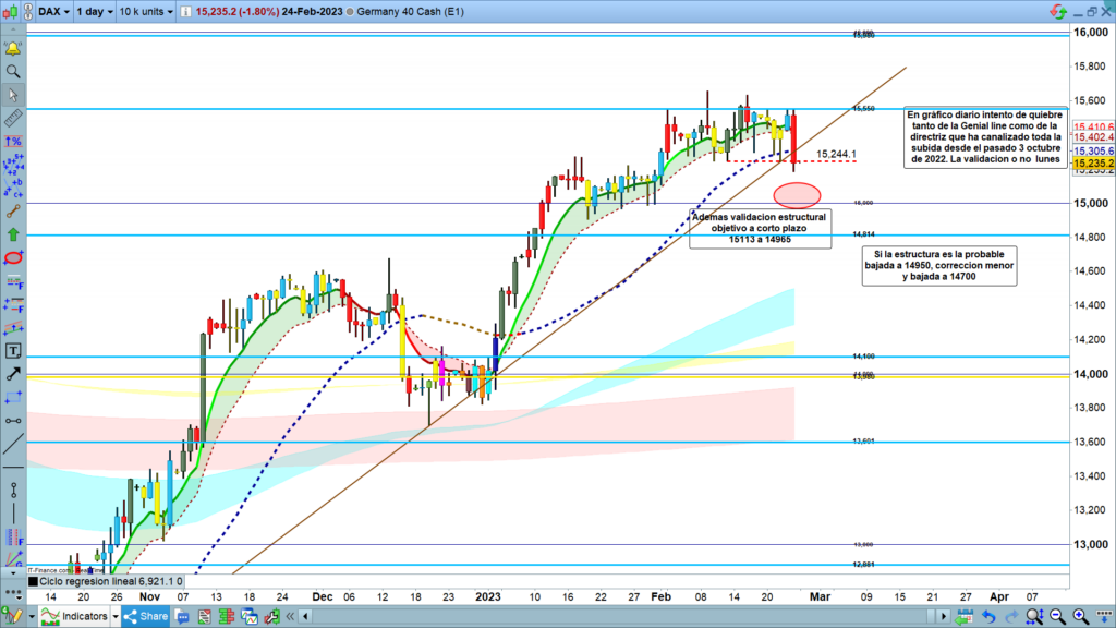 En el gráfico de diario del Dax40, entrando ya más en la zona operable más inmediata, vemos como en gráfico diario, el pasado viernes, la vela cerro por debajo tanto de la Genial line de gráfico diario, como de la directriz de medio plazo que ha estado canalizando el precio desde el cambio de dirección del pasado 3 de octubre de 2022.
