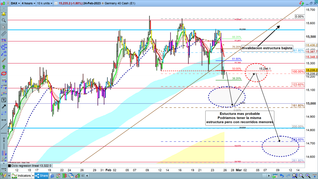 Rebote posiblemente en forma de corrección para después de finalizada tener un nuevo impulso bajista hasta la zona de los 14814, con posibles plumas hasta la zona de los 147xx. Sí llega a esta zona, tendríamos un rebote importante correctivo, como onda 2, de esta estructura inicial, volviendo a la zona de los 15400, a 15465.