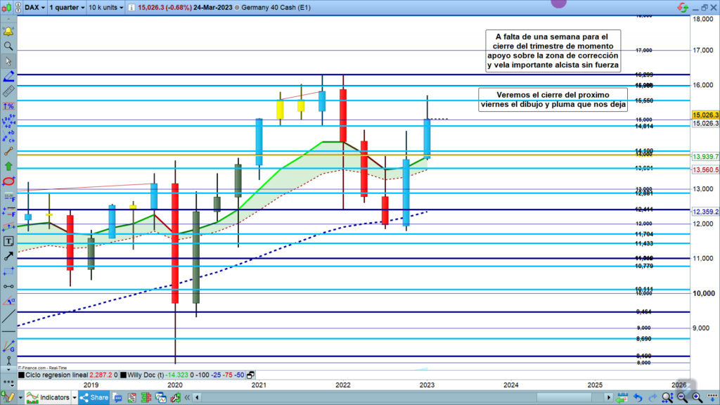 En el gráfico trimestral del Dax40, a falta de una semana, para el cierre del trimestre, de momento vemos como este trimestre, después del quiebre de la zona de corrección con el cierre de fin de año, de momento tenemos una vela por finalizar. Sin duda, dependiendo del recorrido de esta semana, tendremos un tipo de vela u otro, podemos tener una vela de continuidad, o tener una vela de clara fuerza bajista, con una pluma superior más grande que el mismo cuerpo de la vela.