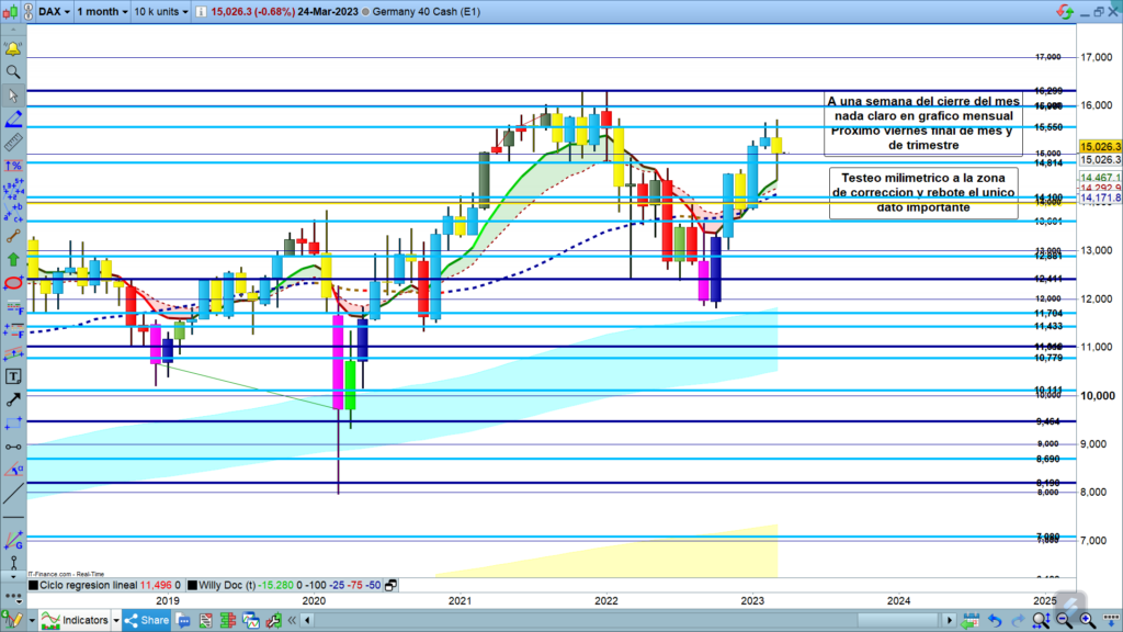 En el gráfico mensual del Dax40, muy poca información significativa, las velas mientras están en curso no son analizables y de momento el dibujo que está dejando la vela del mes de marzo, a falta de una semana para finalizar el mes, de momento no indica nada, ninguna dirección de continuidad.