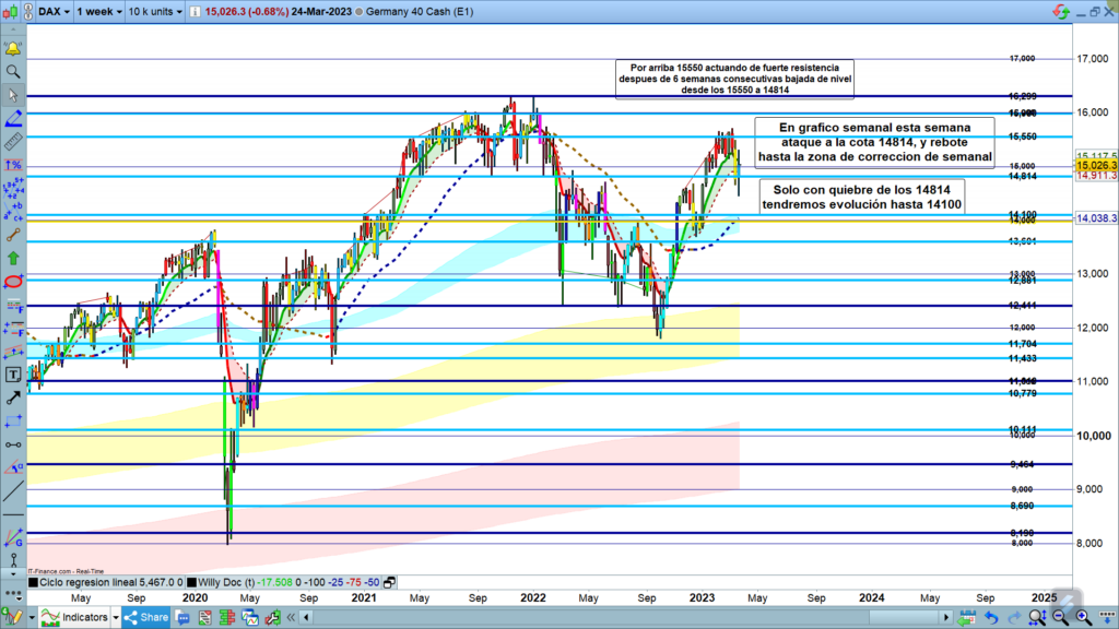 La semana pasada, el viernes, ataco la cota histórica importante de los 14814, y al no poder quebrarla, rebote hasta la zona del 15026, la zona de corrección de gráfico semanal. Mientras estemos por debajo de la zona de corrección de semanal, lo más probable, es nuevo rally bajista para un nuevo ataque a la cota 14814.