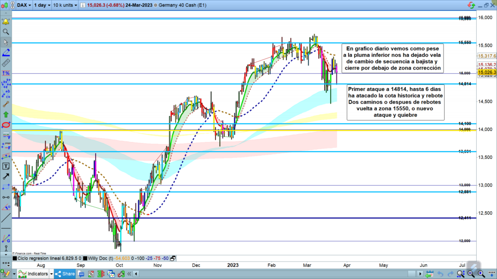 En gráfico diario del Dax40, de momento, pese a la pluma dejada el pasado viernes, la vela del viernes, acabo como vela de color fucsia, de cambio de secuencia a bajista. Además de que acabo cerrando el día por debajo de la zona de corrección de gráfico diario. Todos estos detalles son importantes, porque ahora el lunes si pretende atacar la zona superior, de entrada necesitaría fuerza mucha fuerza para quebrar tanto la zona de corrección de gráfico diario, como tal como hemos visto en el post anterior, también debería superar la zona de corrección de gráfico semanal. Unas resistencias muy importantes y fuertes dada la importancia de los gráficos.