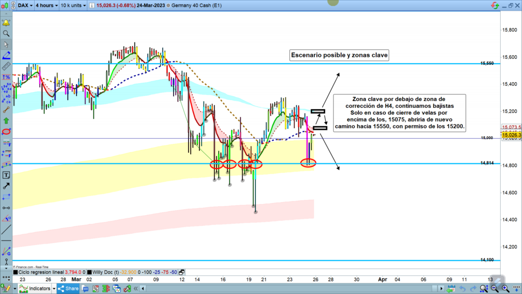 En gráfico de 4 horas del Dax40, de entrada, vemos los diferentes ataques a la cota 14814, que comentaba anteriormente. Fijaros que entre los, 15130 por arriba y los, 15040, tenemos las zonas de corrección de gráficos semanal, diario y gráfico de 4 horas.
