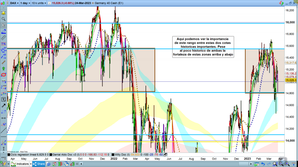 Por otro lado, podemos ver como desde el 15 de marzo, hemos tenido un primer ataque importante a la zona de los 14814, hasta en seis días, el precio ha atacado y testeado la cota histórica importante de los 14814. de momento, solo el viernes 17 de marzo, tuvimos cierre del día por debajo de la cota, sin embargo, al lunes siguiente no tuvimos confirmación de quiebre.