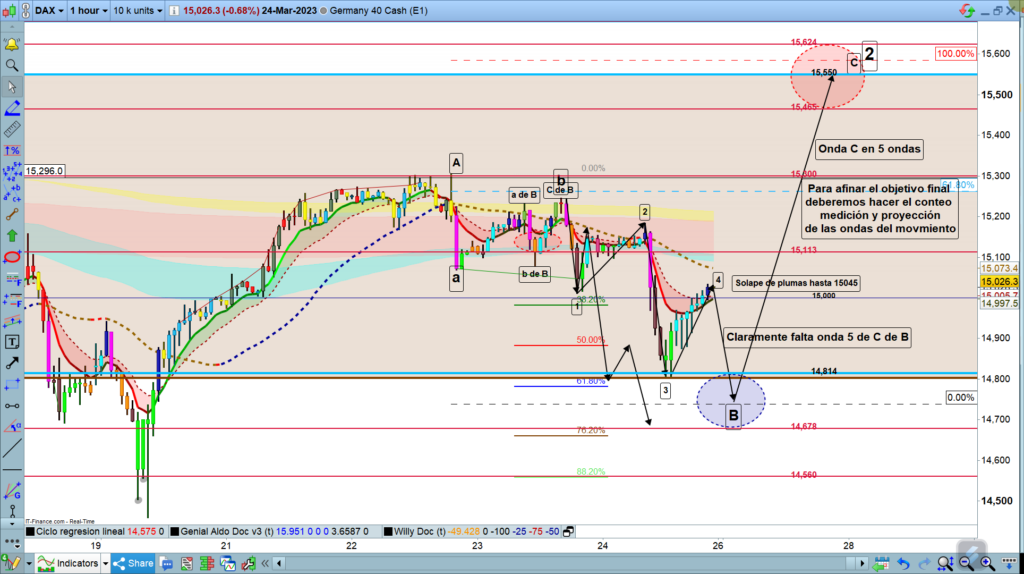 Como veremos en gráfico de 1 hora del Dax40, parece que falta todavía una nueva estructura bajista, con un mínimo por debajo de los, 14814, antes de tener la onda C, y finalizar la onda 2, en la zona de los, 15400 a 15550.