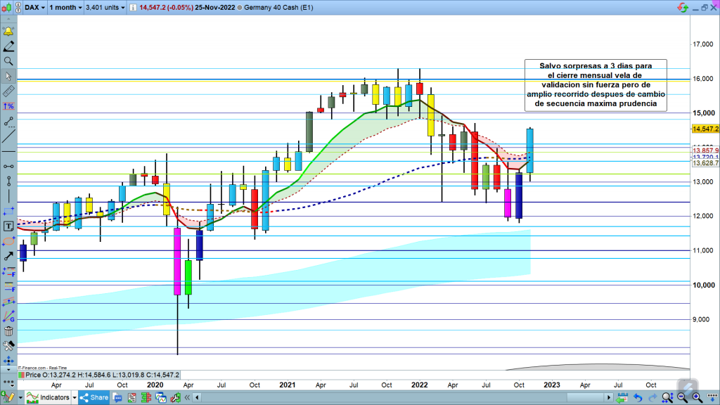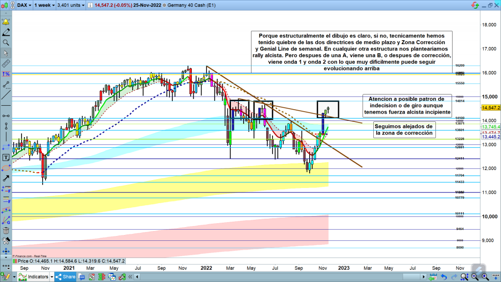 En gráfico semanal del dax40, tenemos bastantes más detalles. Por un lado, El movimiento después del giro en 11809, está ya muy maduro, recorrido casi sin coger aire de casi 3000, puntos. Por otro lado, todo y tener validación, después de la vela de hace dos semanas, vemos como esta última semana, ha apuntado ya una vela que podría ser un posible patrón de indecisión o cambio, muy atentos a esta próxima semana, que se presenta con un fin de mes donde podemos tener mucha volatilidad.