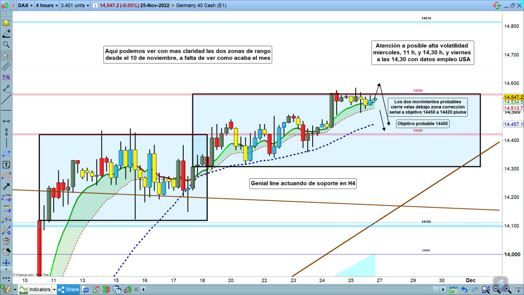 Más en el corto plazo, lunes y martes, posible corrección hasta la zona de los 14450, Genial line de H4, no sé si antes o después de nuevo alto, quizás en la zona 14600. La zona de validación de esta bajada, la parte inferior de la zona de corrección de gráfico de 4 horas.