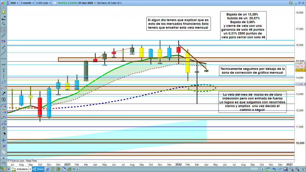 En gráfico mensual del dax40, una vela para la historia. Técnicamente, seguimos en zona bajista, por debajo de la zona de corrección. Gran impulso bajista hasta la zona de 12411, y vuelta para testeo a zona de corrección. En principio deberemos pensar que como confirmación de quiebre, sin embargo, veremos evolución de estas próximas semanas del mes de abril. La vela en sí es histórica para el dax, solo superada en cuanto a recorrido por la del mes de marzo de hace dos años, pero aquella vela, marco amplio recorrido, todo y las amplias plumas, menores que el cuerpo de vela, tuvo un cuerpo de vela de 1938 puntos. En cambio, la vela que acaba de cerrar el pasado jueves, es una vela de patrón doji con casi 2500 puntos de plumas, solo un pequeño cuerpo de menos de 50 puntos, de ahí su peculiaridad. Nunca una vela mensual se había movido tanto para cerrar en el mismo sitio donde empezó. Fijaros que para un solo mes los números son espectaculares, incluso para un inversor. Bajada del 13%, subida del 20% nueva bajada de casi el 4%, y quien no haya cerrado cierre del mes en tablas.